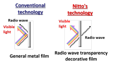 Until now, there has been a significant technical challenge in achieving both radio wave transparency and a beautiful metallic appearance. At Nitto, we have established a technology to solve this challenge by using sputtering process control technology. This is Nitto's unique radio wave transparency film technology, which allows radio waves to pass through smoothly while at the same time reflecting visible light to add a metallic decorative layer. Why not explore new design possibilities with Nitto’s patented technology? |