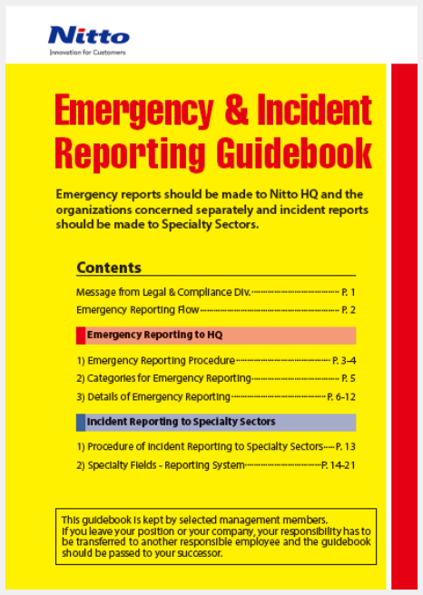 如果发生特大灾害或严重事故,Nitto 集团会立即制定一个应急体系,并通知各高管。《紧急事件报告手册》向员工介绍该内容。当 Nitto 总裁认为有必要时,将立即设立紧急对策本部。在收集和分析损害情况与事件影响的同时,所有受影响的集团公司和据点将获得整个 Nitto Group 的支援。
