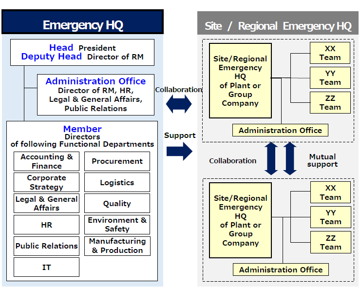 各个据点会根据其地区特有的自然灾害制定应急行动计划。所有员工都会定期接受教育和训练。训练中发现的问题会根据各据点的特点进行系统性改进。